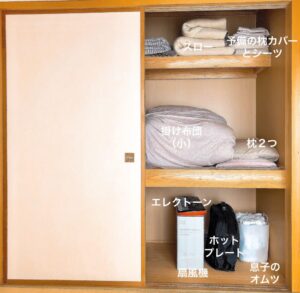 本音をいえば、押入れ右側の扇風機、ホットプレート、オムツもここに置きたくない。