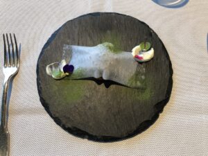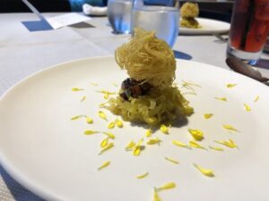 そして蒸すだけでも美味しいインカのめざめが、パスタ仕立てにカリカリに揚げられていました。鮒鮓やテリーヌに合う!