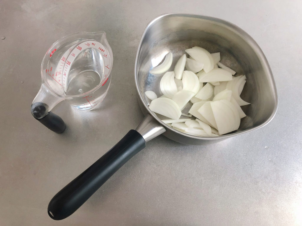 お汁椀で水の量を計っている