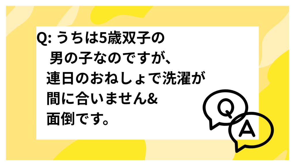 Q: うちは5歳双子の男の子なのですが、連日のおねしょで洗濯が間に合いません&面倒です。