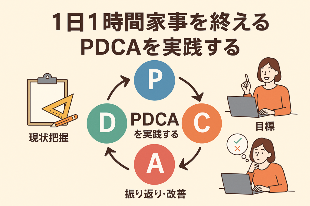 やみくもに家事をこなすのではなく、PDCA(計画・実行・振り返り・改善)を回すことで、無駄な時間や動きがグッと減ります。最初は1時間ぴったりで終わらなくても、回数を重ねるごとに時短効果が高まり、1時間以内で終わるようになります。
