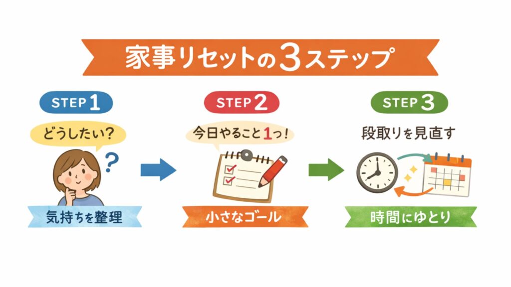 家事リセットとは、単に家事を減らすのではなく、「自分は本当はどうしたいか?」を軸に、家事の優先順位や段取りを整え直すことです。