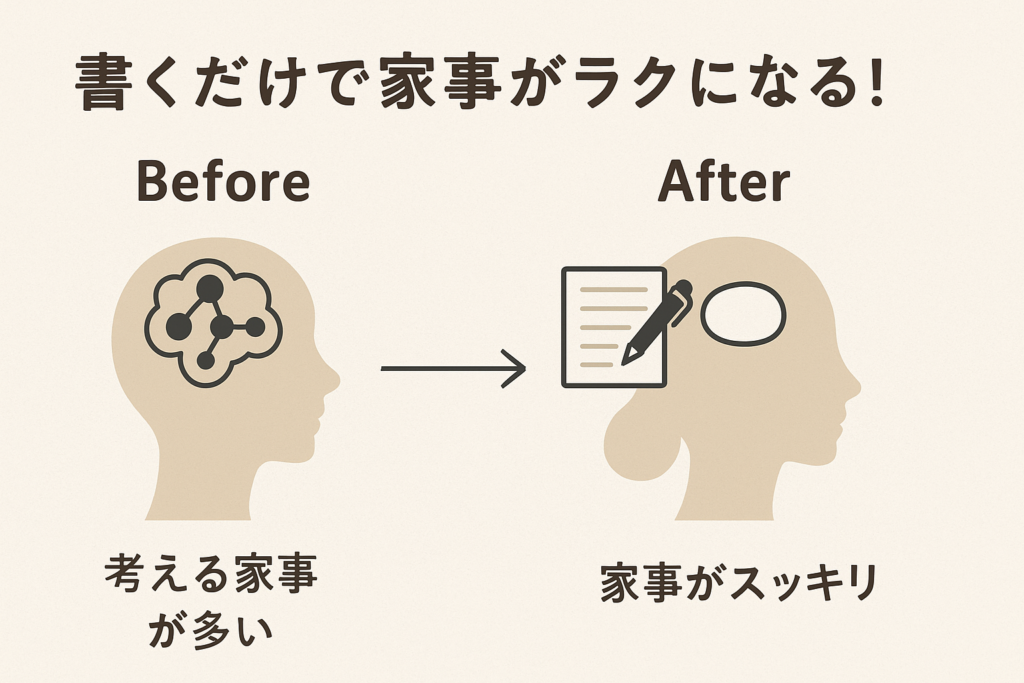 | 脳の状態 | モヤモヤ・ごちゃごちゃ | スッキリ・クリア | 書くことで“考える家事”が減る |