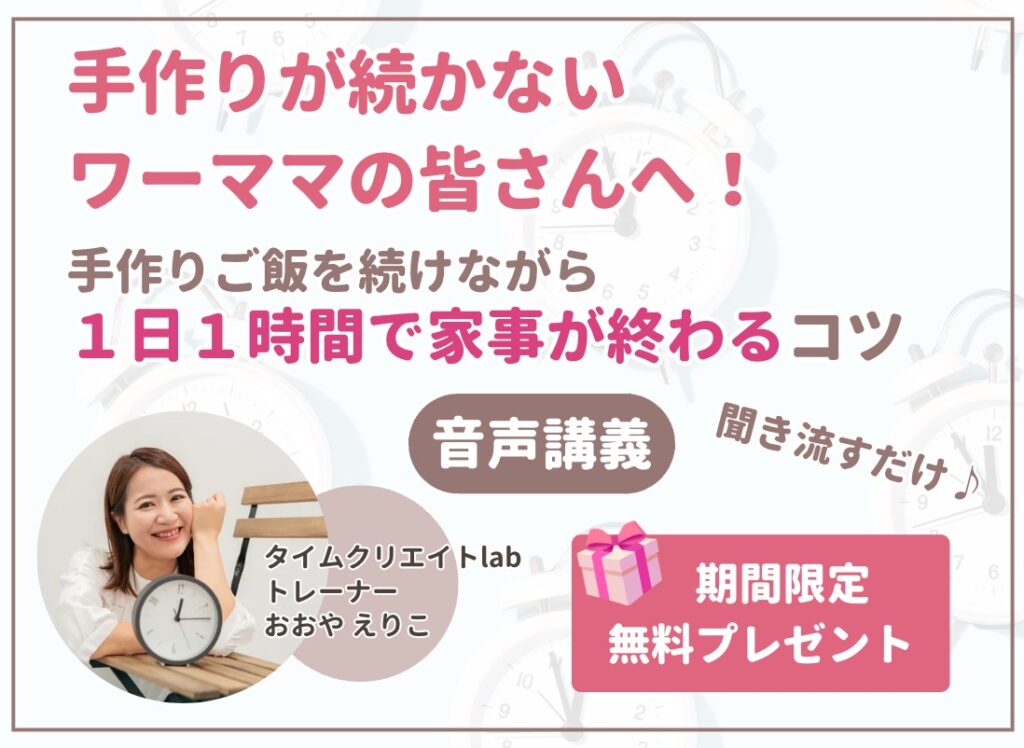 はい。今なら「先取り準備で19時帰宅でも21時就寝を叶える音声講義」が無料で受け取れます。短時間で学べて、実践にすぐ活かせる内容です。