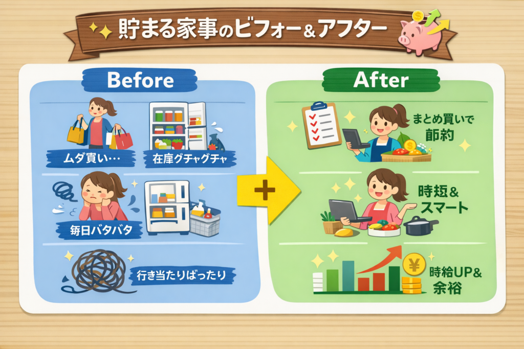 | 段取り力の有無 | 行き当たりばったりで疲弊 | 家事を時間内に収める工夫が定着 | 時間・お金・心が“貯まる”日常 |